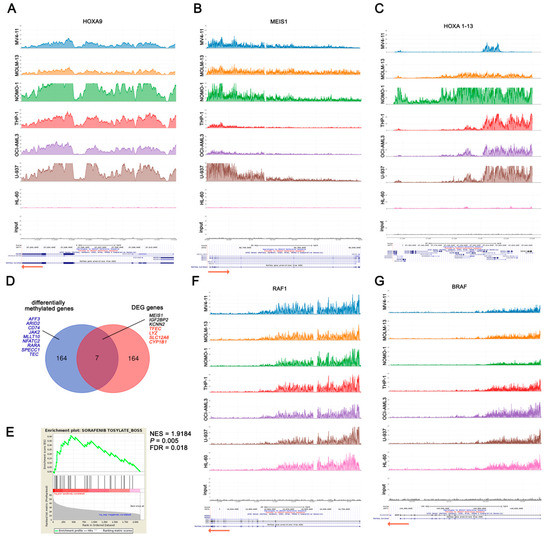 H3K79 methylation in MLL-r and non-MLL-r human AML cell lines. (A–C) are H3K79me2 profiles of MLL target genes. (D) Venn diagram showing the overlap between the 172 genes differentially methylated in MLL-r compared to non-MLL-r human AML cell lines and the 171 genes differentially expressed upon Pinometostat treatment and shared between at least three AML cell lines. Overlapping genes are reported (black: down-regulated genes; red: up-regulated genes). Additional genes with important roles in regulating signaling cascades, transcription, or cell development, and differentially H3K79me2 enriched in MLL-r compared to non-MLL-r, are indicated in blue. DEG: differentially expressed genes. (E) Gene set enrichment analysis (GSEA) of commonly H3K79me2 enriched genes in both MLL-r and non-MLL-r AML cells showing the enrichment in Sorafenib’s drug signature. The normalized enrichment score (NES) and the statistically significant False Discovery Rate (FDR) and p values are indicated. (F) and (G) are H3K79me2 profiles of RAF1 and BRAF, which encode for Sorafenib targets.