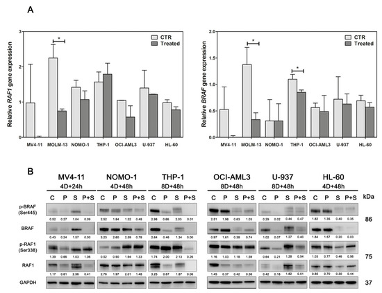 Impact of Pinometostat and Sorafenib on RAF1 and BRAF expression. (A) Assessment of BRAF and RAF1 gene expression in AML cell lines treated with the DOT1L inhibitor Pinometostat for 16 days. CTR: control cells (DMSO 0.01%); Treated: cells treated with 1 µM Pinometostat. Results of three independent replicates are presented. Data are expressed as 2ΔΔCt ± SD, and the universal human reference RNA was used as calibrator. (B) Western blot analysis of BRAF and RAF1 total and phosphorylated proteins in AML cell lines treated with 1 µM of Pinometostat and Sorafenib as single agents or in combination. Combination times are indicated for each cell line (4/8D: 4/8 days). Antibody to GAPDH served as a loading control. Molecular weights are indicated on right. C: control cells (DMSO 0.01%); P: Pinometostat treatment; S: Sorafenib treatment; P+S: combined treatment (Pinometostat and Sorafenib). Densitometric data were normalized on GAPDH.