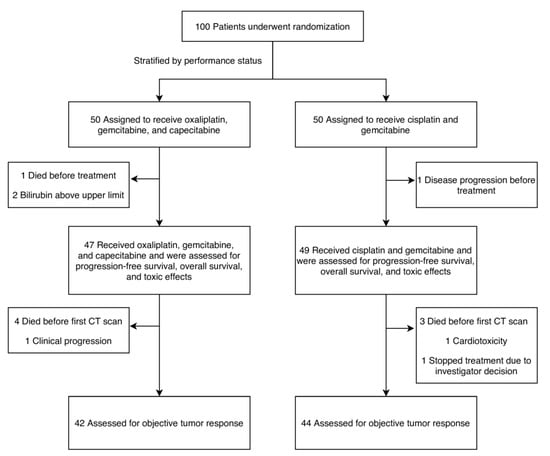 - Kim, S.T.; Kang, J.H.; Lee, J.; Lee, H.W.; Oh, S.Y.; Jang, J.S.; Lee, M.A.; Sohn, B.S.; Yoon, S.Y.; Choi, H.J.; et al. Capecitabine plus oxaliplatin versus gemcitabine plus oxaliplatin as first-line therapy for advanced biliary tract cancers: A multicenter, open-label, randomized, phase III, noninferiority trial. Ann Oncol. 2019, 30, 788–795. [Google Scholar] [CrossRef] [PubMed]