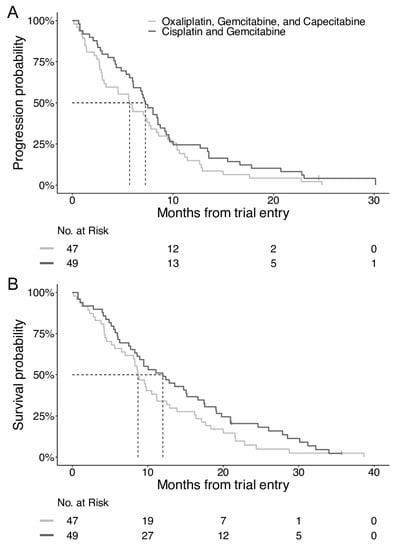 In trials with triple chemotherapy using oxaliplatin, gemcitabine, and capecitabine, lower doses of oxaliplatin were used, either 50–60 mg/m2 every second week in three trials [,,] or 100 mg/m2 every third week []. The four trials [,,,] all had a similar mOS to the ABC-02 trial with cisplatin and gemcitabine.