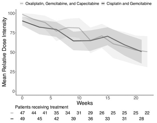 By exploring the mean relative DI, we found that both oxaliplatin and cisplatin were reduced to approximately 50% during treatment, either due to treatment delays or dose reductions (Figure 3). Only 22 patients (47%) received all 12 cycles of oxaliplatin, and only 6 patients (13%) received the full dose in the last cycle. The same was seen for cisplatin, with 28 patients (57%) receiving all eight cycles and seven patients (14%) receiving the full dose in the last cycle.