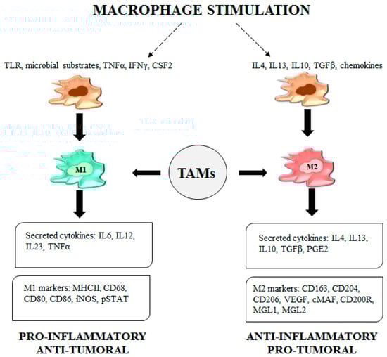 Classically activated macrophages (M1) are crucial for host defense and cancer cell killing. M1 TAMs are stimulated by toll-like receptor (TLR) ligands, microbial substrates such as lipopolysaccharide (LPS) and Th1 cytokines. Once activated, M1 macrophages secrete proinflammatory cytokines and express markers typically used to identify the M1 phenotype [] (Figure 1).