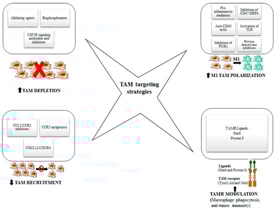An interesting druggable target is represented by the so-called TAMR, a family of three known tyrosine kinase receptors, Tyro3, Axl and MerTK, whose initials form the acronym TAM (unintentionally identical to TAM cells’ acronym), expressed by several cell types including tumor cells and immune cells. These receptors display multiple roles in cell fate, proliferation, migration and in modulating processes like tissue homeostasis and inflammation [].