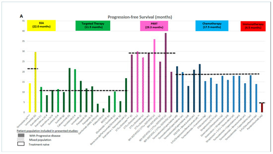 (A) Graphical representation and pooled progression-free survival (PFS) and (B) objective response rate (ORR) by treatment group. Data for the studies summarised in Tables S1–S5 are presented. Mean PFS and ORR are calculated from studies with data available. PRRT: Peptide receptor radionuclide therapy; SSA: somatostatin analogue. a—PROMID trial—Octreotide arm [20,21]; b—CLARINET trial—Lanreotide arm [19,60]; c—Phase II study, Yao et al., 2008—Everolimus arm [102]; d—RADIANT-1—Everolimus arm [22]; e—RADIANT-3—Everolimus arm [24,103]; f—SUN111—Sunitinib arm [26,27]; g—Retrospective, Rinzivillo et al., 2018—Sunitinib arm [65]; h—Phase II study NCT01466036—Cabozantinib arm [71]; i—Phase I/II study NCT02267967—Surufatinib arm [73]; j—TALENT trial—Lenvatinib arm [72]; k—Phase II study, Phan et al., 2010—Pazopanib arm [18]; l—PAZONET—Pazopanib arm [70]; m—Phase II study NCT01024387—Ganitumab (AMG 479) arm [77]; n—PALBONET—Palbociclib arm [74]; o—Phase II study, Salazar et al., 2018—BEZ235 arm [63]; p—SUNEVO (GETNE 1408)—Efosfamide/Sunitinib arm [104]; q—Phase II study, Bendell et al., 2016—Bevacizumab/Pertuzumab/Octreotide arm [105]; r—COOPERATE-2 trial—Everolimus/Pasireotide LAR arm [62]; t—NETTER-1 trial—177Lu-Dotatate arm [36,106]; u—Retrospective, T.Brabader et al., 2017—177Lu-Dotatate arm [37]; v—Prospective observational study, Garske-Román, U et al., 2018—177Lu-Dotatate arm [38,43]; w—Phase II study, Sansovini et al., 2017—177Lu-Dotatate arm [39,43]; x—Prospective trial, Bertani et al., 2016—90Y-DOTATOC/177Lu-DOTATOC arm [41,43]; y—Phase II study, Rogowski et al., 2016—90Y-DOTATOC arm [43,44]; z—Retrospective, Horsch et al., 2016—90Y-DOTATOC/177Lu-DOTATOC arm [43,47]; aa—Retrospective, Baum et al., 2018—90Y-DOTATOC/177Lu-DOTATOC arm [43,46]; ab—E2211 trial—Temozolomide/Capecitabine arm [31]; ac—Retrospective study, De Mestier et al., 2019—Temozolomide/Capecitabine arm [32]; ad—Retrospective study, Campana et al., 2018—Temozolomide/Capecitabine arm [33]; ae—Phase II study, Kunz et al., 2016—FOLFOX + Bevacizumab arm [89]; af—BETTER trial—5-FU/Streptozocin/Bevacizumab arm [28]; ag—Phase I/II, Chan et al., 2013—Temozolomide + Everolimus arm [92]; ah—Phase III study, Moertel et al., 1992—Chlorzotocin-arm [30]; ai—Phase III study, Moertel et al., 1992—Streptozotocin/5-FU arm [30]; aj—Phase III study-Moertel et al., 1992—Doxorubicin/Streptozotocin arm [30]; ak—Retrospective study, Delaunoit et al., 2004—Doxorubicin + Streptozotocin [83]; al—Retrospective, Kouvaraki et al., 2004—Streptozotocin/5-FU/Doxorubicin arm [84]; am—Retrospective, Strosberg et al., 2011—TEM/CAP arm [34]; an—Phase II study, Chan et al., 2012—Temozolomide/Bevacizumab arm [91]; ao—Retrospective, De Mestier et al., 2019—EM/CAP arm [35]; ap—Retrospective, De Mestier et al., 2019—5-FU/Dacarbazine arm [35]; aq—KEYNOTE -028—Pembolizumab arm [49]; ar—Single-arm open-label study, Halperin et al., 2019—Ziv-Aflibercept arm [75]; as—Phase II study, Jin et al., 2016—Panobinostat arm [76]; at—Phase II, Imhof et al., 2011—90Y-DOTATOC arm [42]; au—Expanded access trial, Hamiditaba et al.r, 2017—177Lu-DOTATOC arm [45]; av—Dumont et al., 2015—90Y-DOTATOC/177Lu-DOTATOC arm [40]; aw—Retrospective study, Turner, 2010—Streptozotocin/5-FU/Cisplatin arm [85]; ax—Phase II study, Ramanathan, 2001—Dacarbazine arm [86]; ay—Phase II study, Kulke, 2006—Temozolomide/Thalidomide arm [90]; az—Phase II study, Venook, 2008—5-Fu/Oxaliplatin/Bevacizumab arm [87]; ba—Phase II study, Kunz, 2010—Capecitabine/Oxaliplatin/Bevacizumab arm [88]; bb—Phase II multicentre study, NCT02955069—Spartalizumab arm [50]; * No patients with PanNETs were included in the trial; ** at 24th month; *** NO SEPARATE INFORMATION ABOUT patients with PanNETS; # Central review.