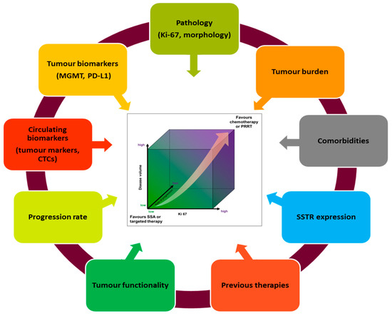 Summary of factors to consider at the time of treatment decision for patients with advanced PanNETs suitable for systemic therapies. Figure adapted from [81]. MGMT—O6-methylguanine DNA methyltransferase; PD-L1—programmed death-ligand 1; SSTR—somatostatin receptor; and, CTCs—circulating tumour cells.