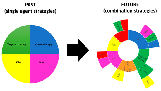 Although some ongoing clinical trials (i.e., SEQTOR [135] or COMPETE [136]) may answer specific questions regarding sequencing between two therapies (chemotherapy vs. targeted (SEQTOR); targeted vs. PRRT (COMPETE)), they are unlikely to answer all of the questions that will arise in clinical practice, in view of the high number of potential sequencing combinations if all therapy options are to be taken into account (Figure 3).