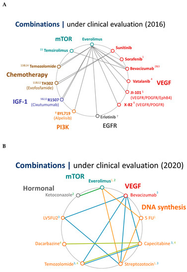 It is also worth highlighting the significant change in the design of ongoing clinical trials in the field (Figure 5). While a few years ago (Figure 5A, most combination strategies were exploring the role of targeted agents combined with other molecules, the current scenario seems very different, with most combination studies exploring the addition of chemotherapy (mainly based on alkylating agents) to other therapeutics strategies (Figure 5B).