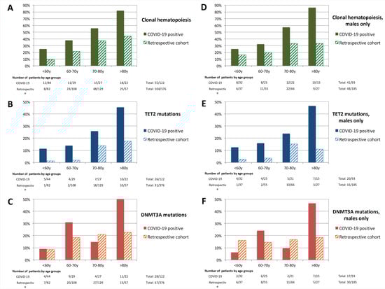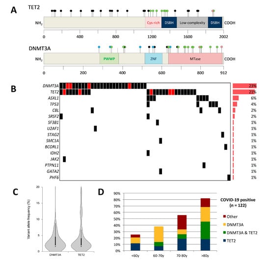 - Buscarlet, M.; Provost, S.; Zada, Y.F.; Barhdadi, A.; Bourgoin, V.; Lépine, G.; Mollica, L.; Szuber, N.; Dubé, M.-P.; Busque, L. DNMT3A and TET2 dominate clonal hematopoiesis and demonstrate benign phenotypes and different genetic predispositions. Blood 2017, 130, 753–762. [Google Scholar] [CrossRef]