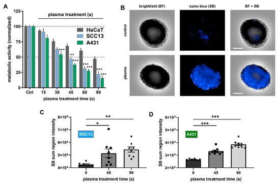 Plasma treatment of SCC in vitro. (A) Metabolic activity of malignant squamous cell carcinoma (SCC) (A431, SCC13) and non-malignant HaCaT keratinocytes 24 h post-exposure to plasma; (B) representative images of 3D tumor spheroids with and without plasma treatment (90s); (C,D) quantitative sytox blue (SB) analysis in SCC13 (C) and A431 (D) tumor spheroids 24 h post plasma treatment. Results are expressed as the mean ± SEM, from 2 to 3 experiments with several replicates each. Statistical analysis was performed using two-way, (A) against HaCaT keratinocytes, or one-way (C,D) analysis of variances against the control condition with p < 0.05 (*), p < 0.01 (**), and p < 0.001 (***). Scale bar = 200 µm.