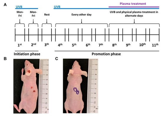 Animal model of UVB-induced skin lesions. (A) Timeline of the experiment; (B) representative animal of the UVB group right before the first plasma treatment (at the end of the seventh week); (C) representative animal of the plasma treatment group (without UVB-induced lesions, at the end of the 11th week after several plasma treatments); the circles indicate the location of the plasma treatment.
