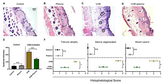 Histopathological evaluation. (A–D) Representative images of murine skin sections stained with hematoxylin and eosin (H&E) from the untreated (control) (A), plasma (B), UVB (C), and UVB + plasma (D) treated mice, respectively (40×); (E) quantification of the epidermal thickness (see black arrow in C as an example); (F) histopathological score of characteristics related to SCC, which includes follicular atrophy, dermal degeneration, and keratin pearls (see black square in C as an example) []. The black circles (C) indicate nests of dysplastic squamous cells reaching the dermis. Results are expressed as the mean ± SEM from 4 to 5 animals per group. Statistical analysis was performed using an unpaired t-test with p < 0.05 (*) and p < 0.001 (***). Scale bar = 100 µm; n.s. = not significant.