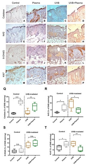 Immunohistochemistry. (A–P) Representative tissue sections stained with antibodies targeting catalase (A–D), nuclear factor E2-related factor 2 (Nrf2) (E–H), 8-hydroxy-2′—deoxyguanosine (8-OHdG) (I–L), and Ki-67 (M–P) in control, plasma, UVB, and UVB + plasma treated mice (100×); (Q–T) quantification of 3,3′-diaminobenzidine (DAB) staining. Results are expressed as boxplots from 4 to 5 animals per group. Statistical analysis was performed using an unpaired t-test with p < 0.05 (*), p < 0.01 (**), and p < 0.001 (***). Scale bar = 200 µm; n.s. = not significant.