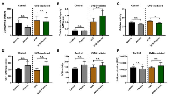 It is known, and further evidence was provided in this work, that plasma treatment has profound effects, seen locally at the site of treatment [,,,,]. It is often assumed that such effects do not spread regionally or systemically, but direct evidence of this assumption is scarce. Skin that was adjacent (several millimeters apart) to the plasma treatment sites was therefore investigated for several antioxidant parameters. This was done in both mice with UVB-induced skin lesions and non-irradiated mice. Analysis of the major antioxidant glutathione (GSH, Figure 5A), as well as the total antioxidant capacity as determined by total radical trapping antioxidant parameter (TRAP) assay (Figure 5B), did not show any significant difference between animals subjected to plasma treatment and non-irradiated controls. However, when analyzing the amount of active catalase, a small but significant decrease was observed in the UVB group (Figure 5C). Next, a potentially systemic action of plasma treatment was investigated by analyzing erythrocytes. The amount of GSH (Figure 5D), superoxide dismutase (SOD) activity (Figure 5E), and lipid peroxidation (malondialdehyde (MDA), Figure 5F) in blood plasma was not significantly different between the plasma-treated and non plasma-treated animals. This indicates that the activity of plasma-derived reactive species is mainly limited to the treatment site, potentially with small regional but not systemic effects of the exposure.