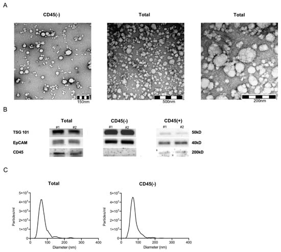 Exosome characterization. (A) Representative transmission electron microscopy pictures of CD45(−) (left) and total (middle and right) exosomes. (B) Western blot for detection of TSG 101, EpCAM and CD45 of total, CD45(−) and (+) exosomes from plasma of head and neck squamous cell carcinoma (HNSCC) patients (#1&2 high stage). Note that no CD45 signal was detected when using CD45(−) exosomes. Uncropped Western blots can be found at Figure S1. (C) Nanoparticle tracking analysis with ZetaView of total (left) and CD45(−) exosomes (right). Vesicles between 30 and 200 nm diameter were detected.