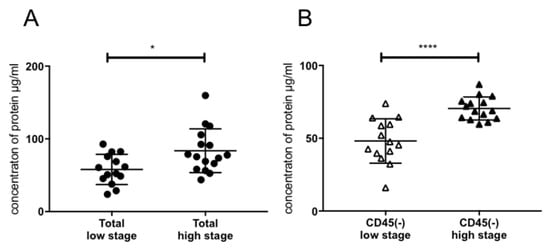 Exosomal protein concentration. (A) Protein concentration of total exosomes from plasma of high and low stage HNSCC patients, n = 30 (B) CD45(−) exosome fraction of high and low stage patients, n = 29. p values were determined with Mann-Whitney test, with * p < 0,05, **** p < 0,0001. Bars represent mean with standard deviation (SD).