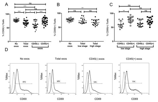 The induction of CD69 expression on cytotoxic CD8+ T cells as a marker of activation was evaluated after incubation with exosomes. Incubation of CD8+ T cells with total exosomes of HNSCC patients showed significant inhibition of CD69 expression (Figure 4A). Total exosomes showed significant inhibition of CD69 expression. However, the CD45(−) exosome fraction induced an even higher suppression of CD69 in CD8+ T cells in contrast to CD45(+) exosomes, which did not affect T cell activation levels at all (Figure 4A). Only exosomes of high stage patients induced a significant reduction of CD69 expression (Figure 4B). Looking at the subgroups no inhibitory influence of CD45(+) exosomes on CD69 levels and, therefore, on CD8+ T cell activity was evident. Interestingly, CD45(−) fractions of both low and high stage patients induced similar levels of CD69 inhibition (Figure 4C). Especially CD45(+) and CD45(−) exosomes of low stage patients presented significantly different levels of CD69 suppression (Figure 4C). Exemplary flow cytometry histograms are shown in Figure 4D.