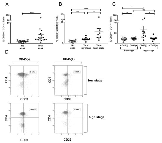 It was previously reported that exosomes from HNSCC upregulated CD39 expression dependent on their immunoinhibitory molecular content [20]. We confirmed CD39 induction on CD4+ T cells by total exosomes (Figure 5A). Furthermore, a stage-dependent induction of CD39 was visible (Figure 5B), with total exosomes of UICC high stage patients inducing significantly more CD39 than those of low stage patients (Figure 5B). When evaluating the CD39 induction by exosome subpopulations, the CD45(+) fraction induced stage-independent low levels of CD39 expression, whereas the CD45(−) high stage fraction induced a relevant increase in CD39 (Figure 5C). Exemplary flow cytometry plots are visible in Figure 5D visualizing the difference between CD39 induction on CD4+ T cells by CD45(+) and CD45(−) exosomes of UICC low and high stage patients.