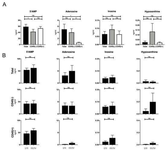 It has been shown previously that exosomes are independent producers of adenosine and other nucleosides due to the presence of CD39 and CD73 on their surface [8,13,20]. Here, we evaluated the nucleoside production by exosomes of different fractions and tumor stage. Figure 6A shows a tumor-stage independent nucleoside production of total exosomes. No significant difference in production of inosine and hypoxanthine was visible. CD45(−) exosomes showed significantly lower 5′AMP levels than CD45(+) and total exosomes. Total and CD45(−) exosomes produced higher adenosine levels compared to CD45(+) exosomes, concluding that the majority of adenosine production derives from the CD45(−), TEX-enriched, fraction. No significant differences were visible when stratifying patients according to their tumor stage (Figure 6B).