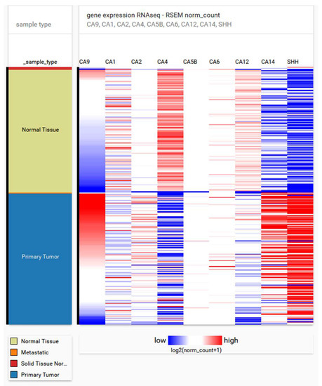The expression profile of selected carbonic anhydrase isoforms and sonic hedgehog (activated in pancreatic cancer) in 179 samples of pancreatic adenocarcinoma and 171 normal pancreatic tissue samples extracted from Xena (using the cancer genome atlas (TCGA) target GTEx datasets) [15] (for more information see Supplementary Material). Expression of CA9 increases in pancreatic ductal adenocarcinoma samples along with Sonic Hedgehog (SHH) level. Analysis of CA9 promoter revealed possible regulation through Sonic Hedgehog (SHH) pathway (see Figure 2). According to the carbonic anhydrase nomenclature, human CA isoenzymes are written in capital Roman letters and numerals, while their genes are written in Italic letters and Arabic numerals.