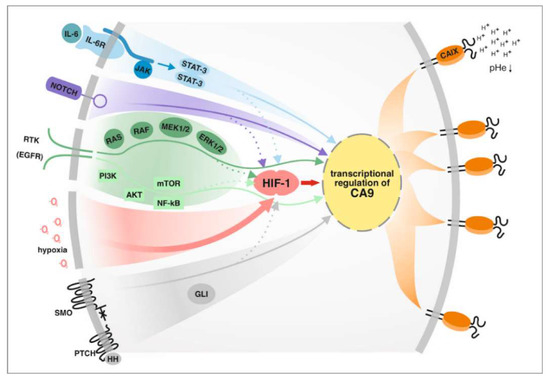 In conclusion, hypoxia and the transcription factor HIF-1 still remain the major transcriptional regulators of CA9 expression. However, the absence of correlation between HIF-1 and CAIX supports the hypothesis that rather than being regulated by hypoxia, CAIX expression could be induced by other signaling pathways and transcription factors. Therefore, the activity of IL-6/STAT-3, EGFR, MAPK, PI3K, as well as HH/GLI, which were all described as essential for pancreatic carcinogenesis, could be relevant for CA9 transcription and should be taken into consideration, especially in situations with no oxygen restrictions. Schematic presentation of signaling pathways relevant in pancreatic cancer and their effect on CA9 expression is illustrated in Figure 2.