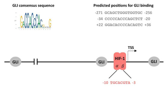 Considering all previously-mentioned indications, we performed a comprehensive in silico analysis of the CA9 promoter sequence using JASPAR [89] and MatInspector [90,91] (Supplementary Material). Through the JASPAR database, we revealed three putative GLI binding sites within the CA9 regulatory sequence (relative profile threshold score was 80%, two of them were upstream and one was located downstream from the TSS; Figure 3). However, using a MatInspector analysis of the same CA9 promoter sequence, we were able to reveal only one putative GLI binding site at position −270/−256 upstream from the TSS, having the matrix similarity 0.938 and the highest core similarity 1. Such discrepancies could be explained by the sensitivity and specificity, as well as the matrix description, which do not reflect binding sites in their genomic context. Although all these binding sites could possibly be recognized by GLI transcription factor, it is important to mention that their functionality and relevance for CA9 transcription has to be verified experimentally.