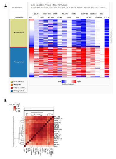 (A) The expression profile of CA9, S100P, and prognostic 15 gene signature panel for Early Stage Pancreatic Ductal Adenocarcinoma in 179 samples of pancreatic adenocarcinoma and 171 of normal pancreatic tissue extracted from Xena (TCGA target GTEx). (B) Pearson correlation coefficient diagram of analyzed genes. CA9 is positively correlated with the 15 gene signature panel as well as S100P (Supplementary Material).