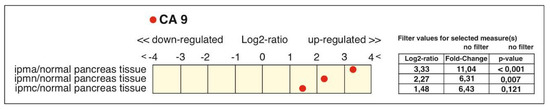 Upregulation of CA9 in intraductal papillary mucinous neoplasm (IPMN) samples compared to normal pancreatic tissue. The analysis was performed in Genevestigator (Nebion AG), a multi-organism microarray data analysis toolbox, using data from experiment No. HS-00705 (GSE19650) comprising 21 samples of intraductal papillary-mucinous adenoma (ipma, n = 6), adenocarcinoma (ipmc, n = 6), invasive carcinoma (ipmn, n = 3), and normal pancreatic duct tissue (n = 6). The graph shows a log fold change between various types of mucinous neoplasia tissues and healthy tissue samples; p denotes significance of changes.