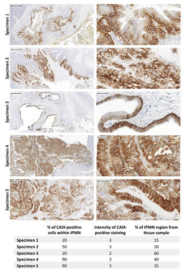 Immunohistochemical staining of CAIX in IPMN lesions within pancreatic ductal adenocarcinoma (PDAC) patient samples. The set of 5 IPMN tissue specimens were immunostained using the specific anti-CAIX monoclonal antibody M75 [143] as described previously [144] (Supplementary Material). Representative pictures taken from all 5 IPMN tissue specimens (left side) were complemented with detailed pictures (right side) describing CAIX-specific staining pattern (brown). All sections were counterstained with Mayer’s hematoxylin (blue nuclei). Scale bar 500 μm (left side) and 50 μm (right side).