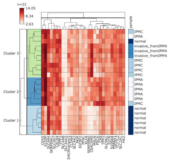 Hierarchical clustering of GSE19650 samples according to the panel of Genes Highly Expressed in IPMNs as Compared with Normal Pancreatic Ductal Epithelium and Genes Associated with Invasive Intraductal Papillary Mucinous Neoplasms of the Pancreas [139], selected pH regulators (SLC4A7, SLC4A4, SLC4A8, SLC4A2, SLC9A1), and glycolysis-related genes (HK2). Genes from the panel of Sato et al. (2004) as well as CA9 show a mutual correlation and a differential expression between normal healthy samples and IPMN samples. Hierarchical cluster analysis was able to correctly cluster the majority of normal healthy tissue samples into one cluster and all mucinous neoplasm samples were grouped into two clusters: cluster 2 contains mainly non-invasive adenoma samples, while cluster 3 includes the majority of adenocarcinoma with invasion and invasive carcinoma.