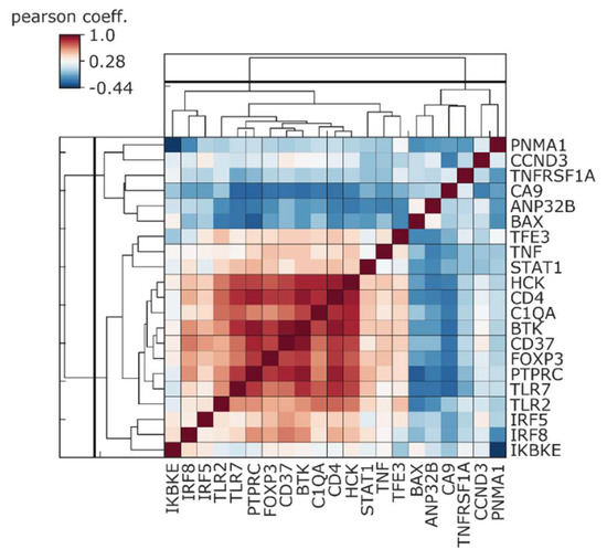 Negative correlation between CA9 and immune panel genes which are upregulated in samples with better prognosis. The analysis was performed with GSE19650 consisting of intraductal mucinous neoplasia and normal tissues. Immune gene panel indicates immune-related genes as predictors of outcome in pancreatic adenocarcinoma according to D’Angelo et al. [145].