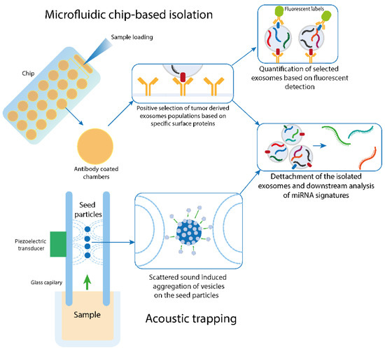 Overview of the principles of microfluidic and acoustic trapping EV isolation methods. Novel isolation methods can either use selective markers for isolations specific markers, such as the antibody-coated chips or rely on the size and physical properties of the analytes in the samples, such as the aggregation of the exosomes around seed particles following the entrapment by the scattered sound waves. Immunocapturing the exosomes can be informative regarding the specific populations of exosomes based on the utilized marker and a sandwich-type model employing additional fluorescent-labeled antibodies can be used for quantification. While the further applications, efficiency, and selective potential of these methods differ, the analysis of the miRNA signatures of the captured exosomes in both cases is done after their release from utilized isolation platform.