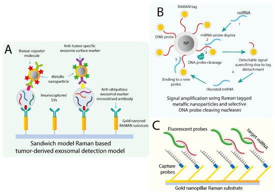 Raman scattering is a process based on the vibrational signature of individual chemical bonds following photonic excitation [151]. This allows the identification of specific molecules based on vibrational fingerprint, offering information about the components in a mixture, such as a biological sample. Yet, Raman scattering is normally a rarely occurring process, as only one in a million photons scatter inelastically. Therefore, methods of amplifying the scattering signal have concluded that by adsorbing the investigated molecule on a metal surface, the signal is increased drastically and allows for the detection of lower concentrated analytes. The technical adaptation of this method resulted in the Surface-Enhanced Raman Scattering (SERS), a Raman based spectroscopy that employs the use of optically characterized Au or Ag nanostructures in the form of 2D nanostructures or colloidal nanoparticles to amplify the scattering signal (Figure 2). Metallic particles provide enhancing properties to the detectable signal due to a combination of electromagnetic and chemical effects [152]. The extension of SERS for biomedical use required additional methodological adaptations that allowed the detection of DNA, proteins, miRNAs, and exosomes from a variety of biofluids [153,154]. The detection of biological molecules is usually done using either an unlabeled or labeled approach. The label-free SERS detection is based on the direct adsorption of the molecule of interest on the used metallic nanostructure or particle followed by the detection of the spectra based on the vibrational signature [154]. One of the first SERS-based miRNA detection systems developed more than a decade ago utilized a label-free sequence-dependent method to distinguish different miRNAs with high accuracy. The group utilized an oblique angle vapor deposition (OAD) method to create specially aligned silver nanorod arrays the would be used as SERS substrates for miRNA detection. Following this, the group was able to identify and differentiate between five synthetized unrelated miRNAs and all the members of the let-7 mRNA family based on the SERS spectral signature determined by the vibrational signature corresponding to their nucleotide composition [155]. However, while the method could differentiate between miRNAs at one nucleotide level, no further development of this method for clinical use has been employed at this moment.