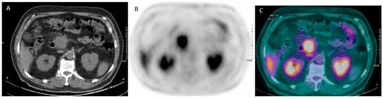All pre-treatment PET/CT were performed at a single PET/CT Centre, 60 ± 10 min after the injection of 236 ± 45 MBq of 18F-FDG, according to the body mass index, from the skull base to mid-thigh region, using an integrated PET/CT device (Gemini GXL by Philips Medical System, Cleveland, OH, USA, or Biograph mCT by Siemens Healthineers, Chicago, IL, USA). All patients fasted for at least 6 h, presented blood glucose level < 150 mg/dl and were in optimal hydration state (i.v. administration of 500 mL of saline solution) at the time of tracer injection. An X-ray scout was performed to define the spatial range of acquisition, as well as a low-dose CT scan (120Kv, 50–80mA) for photon attenuation correction and fusion with PET images for anatomical localization of functional finding. PET scans were produced in 3D mode, with an acquisition time of 2–3 min per bed position, and reconstructed with iterative algorithms. Qualitative and semi-quantitative evaluation of PET images was performed by two independent nuclear medicine physicians (who were informed of all clinical and imaging information available at staging, but not made privy to the patients’ final outcome). Any focal increase in 18F-FDG outside normal distribution or higher than the surrounding physiological uptake at the first visual evaluation was considered an abnormal finding (see Figure 1 as representative case). Any disagreement was resolved by consensus. A 3D Volume of Interest (VOI) was manually placed over the primary tumour and the corresponding SUVmax, defined as maximum activity concentration (kBq/mL) in the VOI adjusted to the injected activity (MBq) and body weight (Kg), was measured applying the EQ∙PET reference-based quantification technology (developed by Siemens Healthineers) []. The MTV (expressed in cm3) was measured using a threshold of 40% of the SUVmax, visually checking the success of tumour delineation, with the TLG calculated as the product of the SUVmean and the MTV.