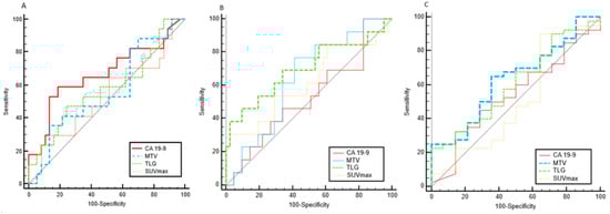 ROC curve comparison of predictors of Early Progression (EP) (A), Local Progression (LP) (B), and Overall Survival (OS) (C). The variables analyzed were CA 19-9 levels, the metabolic tumour volume (MTV), the total lesion glycolysis (TLG) and the maximum standardized uptake value (SUVmax) of primary tumour.