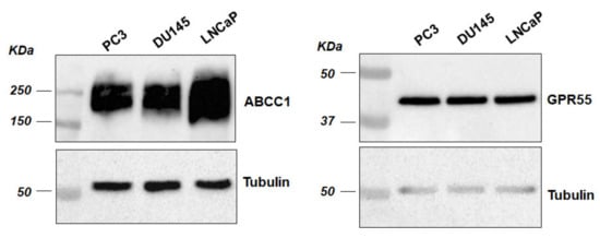 ATP Binding Cassette transporter C1 (ABCC1) and G protein-coupled receptor (GPR55) are expressed in prostate cancer cells. Expression of ABCC1 and GPR55 was assessed by Western blot analysis of lysates from the indicated prostate cancer cell lines. Membranes were stripped and re-incubated with anti-tubulin to confirm equal loading. The whole blot images can be found in Figure S13.