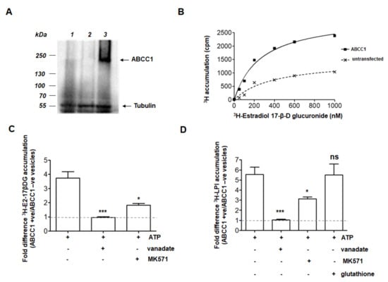 To confirm the role of ABCC1 as an LPI transporter, we transiently expressed ABCC1 in HEK293T cells. This cell line was selected because it has been used by many groups as a naïve line in which to study these transporters following transient or stable expression. In particular, it has been reported that the endogenous levels of ABCC1 are not detectable in these cells [17]. Consistent with this, we observed that expression of the transporter was clearly detected by Western blot in whole cell lysates prepared from cells transfected with a plasmid encoding for ABCC1 but not the naïve HEK293T cells or cells transfected with the empty vector (Figure 2A). Membrane vesicles were prepared and incubated in a reaction buffer containing ATP and the ligand of interest in order to measure the ability of the transporter to transfer the ligand from the buffer into the lumen of inside-out vesicles (only in this fraction of vesicles will the normally cytosolic nucleotide-binding domains be exposed to the added ATP). The in vitro assay was validated by measuring the transport of radiolabelled estradiol 17-β-D-glucuronide (3H-E2-17βDG), a known transport ligand of ABCC1 [6]. Data confirmed increased accumulation of 3H-E2-17βDG in vesicles from ABCC1-expressing HEK293T cells compared to vesicles derived from untransfected cells, describing Michaelis–Menten kinetics with a Km of 266 nM 3H-E2-17βDG (Figure 2B). Accumulation was inhibited by the ATPase inhibitor vanadate (Figure 2C), confirming a primary-active mechanism of transport, as expected for an ABC transporter. Transport of 3H-E2-17βDG was also inhibited by the ABCC1-specific inhibitor MK571 (Figure 2C), further validating the expression of functional ABCC1 in the in vitro assay.