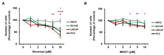 Pharmacological inhibition of ABCC1 reduces prostate cancer cell growth. Normal, immortalised epithelial prostate cells (PNT2) and prostate cancer cells (DU145, LNCaP, PC3) were treated with increasing concentrations of the ABCC1 inhibitors Reversan (A) and MK571 (B) or vehicle, dimethyl sulfoxide (DMSO) alone. Number of cells was assessed after 72 h by cell counting. Data are expressed as percentage of number of cells treated with DMSO (control) and are means ± SEM of n = 3 independent experiments performed in duplicate. For each cell line, one-way ANOVA with Dunnett’s multiple comparisons test was used for statistical analysis between each treatment and its corresponding control. Analysis was performed with GraphPad Prism version 6.0. * p < 0.05, ** p < 0.01, **** p < 0.0001.