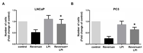 Importantly, addition of exogenous LPI was able to counteract the effect of Reversan, resulting in increased LNCaP (Figure 4A) and PC3 (Figure 4B) cell numbers compared to cells treated with the inhibitor alone. On the other hand, exogenous LPI did not affect cell numbers significantly in the absence of the inhibitor (Figure 4A,B).