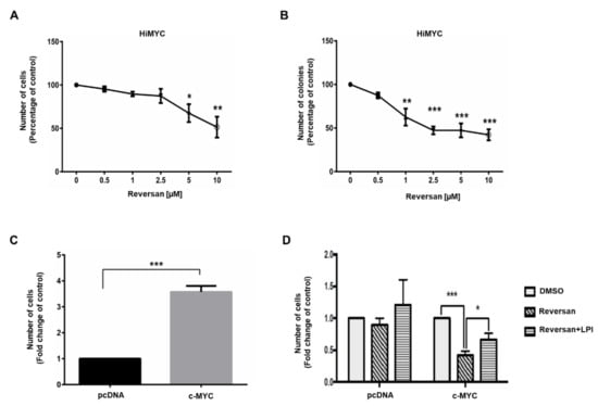 Furthermore, we observed that Reversan inhibited both anchorage-dependent (Figure 5A) and anchorage-independent (Figure 5B) growth of HiMYC cells, a prostate cancer cell line derived from a mouse model that is genetically engineered to exhibit prostatic intraepithelial neoplasia and invasive malignancy upon overexpression of c-MYC [18]. Importantly, a direct correlation between c-MYC overexpression and ABCC1 upregulation has been observed in breast cancer [19] and aberrant expression of c-MYC has been detected in a number of human malignancies including prostate epithelial neoplasia [20,21]. All prostate cancer cell lines used in this study express c-MYC (Figure S1), consistent with previous data [22,23]. These observations, together with our data from HiMYC cells, prompted us to investigate the potential role of c-MYC in the regulation of the LPI-dependent, ABCC1-mediated proliferative autocrine loop. To this end, PNT2 cells were transfected with a plasmid encoding for c-MYC or the corresponding empty plasmid (pcDNA). Efficient overexpression was confirmed by quantitative real time PCR (Figure S2). First, we observed that overexpression of c-MYC increased the numbers of PNT2 cells (Figure 5C). Consistent with data in Figure 3A, Reversan did not affect growth of PNT2 cells transfected with pcDNA (Figure 5D). On the other hand, Reversan strongly reduced the number of cells overexpressing c-MYC (Figure 5D), indicating that, in these cells, ABCC1 inhibition was able to reduce c-MYC-induced cell growth specifically. Moreover, addition of exogenous LPI counteracted the effect of Reversan in c-MYC-expressing cells without significantly affecting the number of pcDNA-transfected cells (Figure 5D).