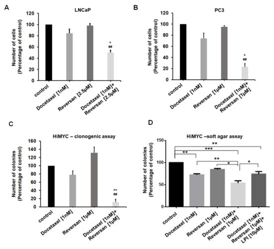 Effect of combinations of sub-optimal concentrations of Reversan and Docetaxel on prostate cancer cells growth. LNCaP (A) and PC3 (B) cells were treated with the indicated concentrations of Docetaxel or Reversan or combinations of the two drugs. Number of cells was assessed after 72 h by cell counting. * p < 0.05 vs. Docetaxel; ## p < 0.01 vs. Reversan. (C) HiMYC cells were plated as single cells in a clonogenic assay and incubated in the presence of Docetaxel, Reversan or a combination of the two drugs at the indicated concentrations. Number of 2D colonies was assessed as specified in the Materials and Methods section. ** p < 0.01 vs. Docetaxel; ## p < 0.01 vs. Reversan. (D) HiMYC cells were plated on soft agar and incubated in the presence of Docetaxel, Reversan or a combination of the two drugs at the indicated concentrations. Where specified, LPI was also added. Number of 3D colonies was assessed as specified in the Materials and Methods section. * p < 0.05, ** p < 0.01, *** p < 0.001. In all panels, data are expressed as percentage of results from cells treated with vehicle (control) and are means + SEM from n = 3 independent experiments.