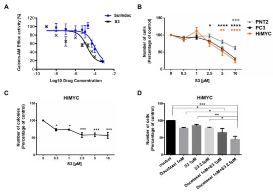 Once confirmed that S3 was able to inhibit ABCC1 activity, we performed a dose response analysis in additional prostate cancer cell lines and PNT2 cells. Consistent with data in LNCaP cells (Figure S5), S3 reduced the number of both HiMYC and PC3 cells (Figure 7B). Data also suggested that cancer cells were more sensitive to the inhibitor compared to PNT2 cells (Figure 7B). Treatment with increasing concentrations of S3 impaired the ability of DU145 (Figure S7A,D), LNCaP (Figure S7B,D) and PC3 (Figure S7C,D) cells to form colonies in clonogenic assays. In addition, S3 inhibited HiMYC colony formation in soft agar (Figure 7C). Importantly, a combination of a low concentration of Docetaxel (1 nM) with S3 (2.5 µM) reduced the number of HiMYC cells more potently than each drug alone (Figure 7D).
