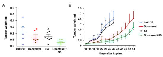 Taken together these data indicate that treatment with S3 is able to potentiate the effect of Docetaxel in vivo.