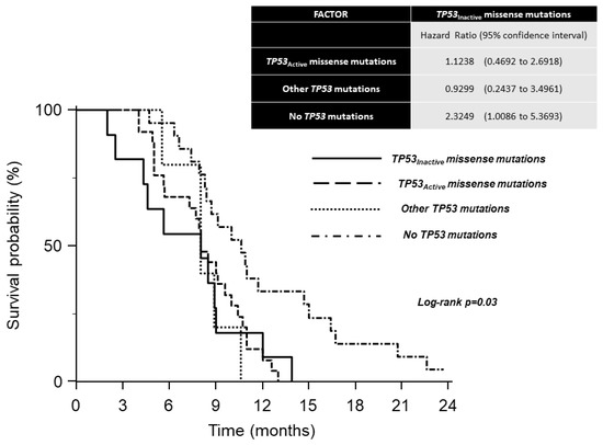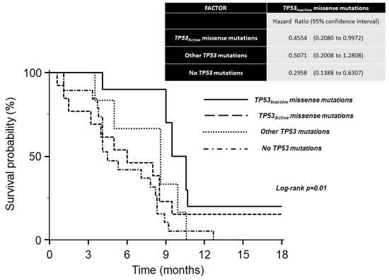 Median OS times were: 9.5 months (9.0–10.7 months 95% CI) in carriers of TP53Inactive missense mutations; 8.6 months (5.9–9.9 months 95% CI) in carriers of other TP53 mutations; 6.0 months (3.2–8.5 months 95% CI) in carriers of TP53Active missense mutations; 4.5 months (4.1–8.2 months 95% CI) in patients without TP53 mutations. A significant difference was observed between the survival curves of the four groups using the log–rank test (Figure 1). The analysis of hazard ratios with 95% CIs indicates the survival advantage of carriers of TP53Inactive missense mutations over other groups except for carriers of other TP53 mutations (Figure 1). The favorable effect of the TP53Inactive mutational status was retained in the multivariate model (Figure 2).