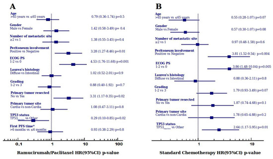 Results of the multivariate model analysis for overall survival in the Ramucirumab/Paclitaxel (A) and Standard Chemotherapy (B) treatment groups. Abbreviations: HR, Hazard Ratio; CI, confidence interval; ECOG PS, Eastern Cooperative Group Performance Status; PFS, progression-free survival. First PFS time* is a variable for second-line Ramucirumab/Paclitaxel therapy only.