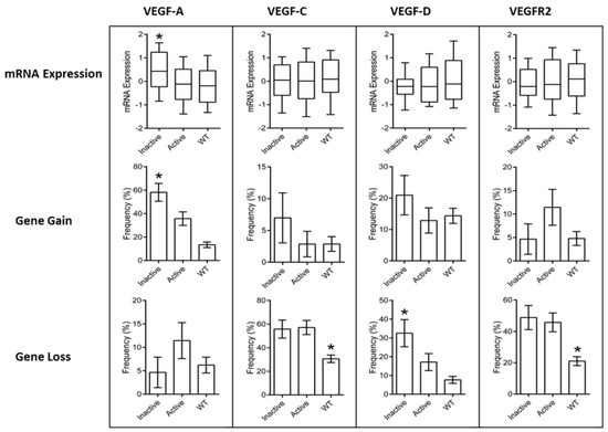 Plots of vascular endothelial growth factor (VEGF)/VEGF receptor 2 (VEGFR2) analysis in gastric cancer tissues. Data were collected from the TCGA PanCancer Atlas. * indicates statistically significant differences between groups as described in the text.