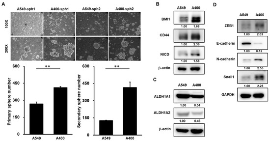 Cancer stem cell (CSC) activity and epithelial-to-mesenchymal transition (EMT) signature is upregulated in pemetrexed-resistant non-small-cell lung cancer (NSCLC) cells. (A) The CSC activity in A549 cells or their derived pemetrexed-resistant A400 cells was determined by tumorsphere cultivation. Primary tumorspheres (sph1) were counted at Day 21 by an inverted light microscopy after cultivation. Single cells of primary tumorspheres were obtained by HyQTase dissociation and used for secondary tumorsphere formation (sph2). ** p < 0.01. (B,C) The total proteins were collected from A549 or A400 cells and western blotting was performed to determine the expression of cancer stemness factors (B), aldehyde dehydrogenase (ALDH) isoforms (C), or EMT-related proteins (D). All the experiments were done two times and data from one experiment were presented.