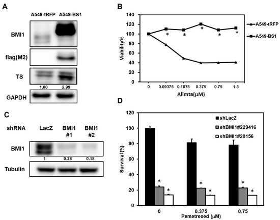 Manipulating BMI1 expression in NSCLC cells influences the pemetrexed sensitivity. (A,B) A549 cells were transduced with lentiviruses of tRPF control (A549-tRFP) or flag-tagged-BMI1 (A549-BS1) and selected with 20 µg/mL blasticidin S for 96 h. The expressions of flag tagged-BMI1 and TS in A549-tRFP or A549-BS1 were examined by western blot (A). The pemetrexed sensitivity of A549-tRFP or A549-BS1 cells were determined by MTT assay (B). * p < 0.05. (C,D) A400 cells were transduced with lentiviruses carrying sh-LacZ or sh-BMI1 (#1 or #2) and selected with 2 µg/mL puromycin for 48 h. The survived cells were harvested and BMI1 expression was examined by western blot (C) or pemetrexed sensitivity was examined by MTT assay (D). * p < 0.05. All the experiments were done three times and data from one experiment were presented.