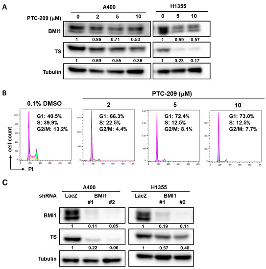 Inhibition of BMI1 in NSCLC cells down-regulates TS expression. (A) BMI1 inhibitor, PTC-209, was used to treat A400 or H1355 NSCLC cells at the indicted concentration for 48 h and the total proteins were harvested for determination of BMI1 or TS expression by western blot. (B) A400 cells were treated with the indicated concentration of PTC-209 for 24 h and harvested for cell cycle analysis using propidium iodide (PI) staining and the fluorescence was detected by a flow cytometry. As a vehicle control, 0.1% dimethyl sulfoxide (DMSO) was used. The percentage of cells at each cell cycle phase was quantified by FlowJo software. (C) A400 or H1355 NSCLC cells were transduced with lentiviruses carrying sh-LacZ or sh-BMI1 (#1 or #2) for 48 h and the protein expression of BMI1 or TS was determined by western blot. All the experiments were done two times and data from one experiment were presented.
