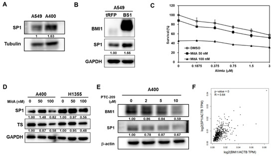 It has been reported that SP1 could trans-activate TS expression in MCF7 breast cancer cells [29]. We next examined the role of SP1 in pemetrexed NSCLC cells. The protein expression of Sp1 was more upregulated in A400 cells than that of parental A549 cells (Figure 5A). Overexpression of BMI1 in A549 cells upregulated both SP1 and TS expression (Figure 5B). The SP1 inhibitor, mithramycin A (MitA), was used to treat pemetrexed-resistant A400 cells and results showed that MitA dose-dependently suppressed the proliferation of A400 cells with or without pemetrexed treatment (Figure 5C). MitA treatment in A400 or H1355 cells dose-dependently inhibited TS expression (Figure 5D). Using PTC-209 to inhibit BMI1 activation in A400 cells, we found that PTC-209 also inhibited SP1 protein expression (Figure 5E). We further found that there was a positive correlation between BMI1 and SP1 mRNA expression in the Cancer Genome Atlas (TCGA) database using the Genen Expression Profiling Interactive Analysis webtool (GEPIA, http://gepia.cancer-pku.cn/index.html) (R = 0.64, p = 0, Figure 5F). It indicates that BMI1 is an upstream signaling molecule of Sp1 or TS expression in pemetrexed NSCLC cells.