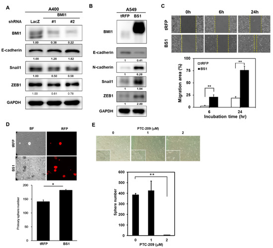Overexpression of BMI1 induces EMT in A549 NSCLC cells. (A) A400 cells were transduced with lentiviruses carrying shLacZ, shBMI1#1, or shBMI1#2, respectively, for 72 h and the total cellular proteins were collected for western blot analysis of BMI1 or the EMT-related molecules including E-cadherin/Snail1/ZEB1. GAPDH was used as a protein loading control. (B–D) A549 cells were transduced with lentiviruses of tRPF control (A549-tRFP) or flag-tagged-BMI1 (A549-BS1) and selected with 20 µg/mL blasticidin S for 96 h. The protein expressions of BMI1 and the EMT markers including E-cadherin/N-cadherin/Snail1/ZEB1 were determined by western blot (B). Cell migration abilities of A549-tRFP or A549-BS1 cells were analyzed by wound healing assay (C). ** p < 0.01. The CSC activity of A549-tRFP or A549-BS1 cells were assessed by tumorsphere cultivation (D). The red fluorescent protein (RFP) signals (upper panel) and tumorsphere numbers (lower panel) were captured and counted with an inverted fluorescence microscopy at Day 14. * p < 0.05. (E) Tumorsphere cultivation was performed on A400 cells in the presence of 1 or 2 µM PTC-209 and the formed tumorspheres were pictured (upper panel) and counted (lower panel) at Day 14. ** p < 0.01 as compared to DMSO control. All the experiments were done two times and data from one experiment were presented.